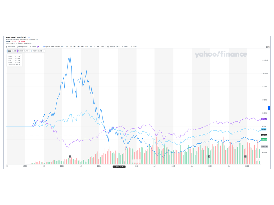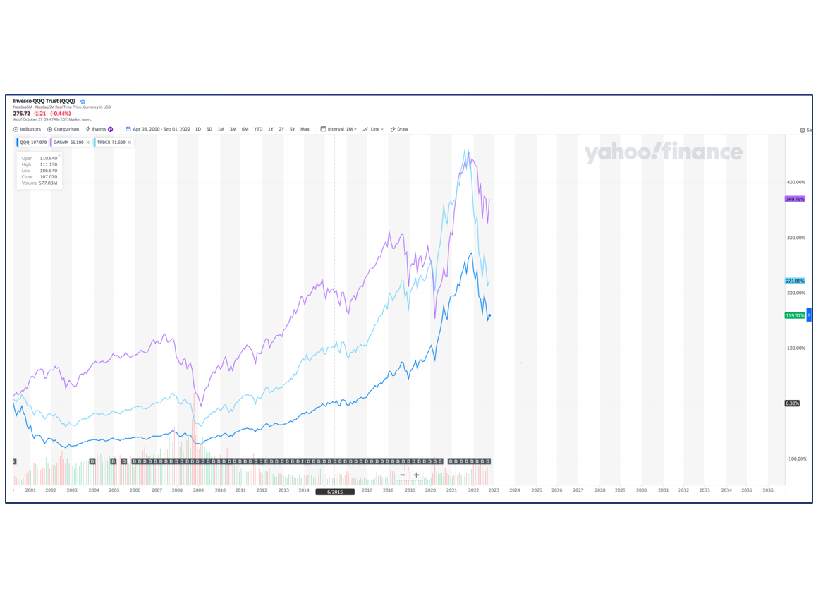 10/1/1999 – 10/20/2022 QQQ (GROWTH ETF) AND TRBCX (GROWTH ETF) VS. OAKMX (LARGE CAP VALUE ETF)
